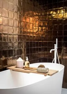 Gouden wandtegels zorgen voor een opvallend accent en geven muren een luxueuze glans. Blauwe tinten variëren van luchtig lichtblauw tot diep marineblauw, ideaal om rust of juist intensiteit neer te zetten. Ook terracotta en brons voegen een rijke, aardse nuance toe waarmee je muren een onderscheidend accent krijgen.
