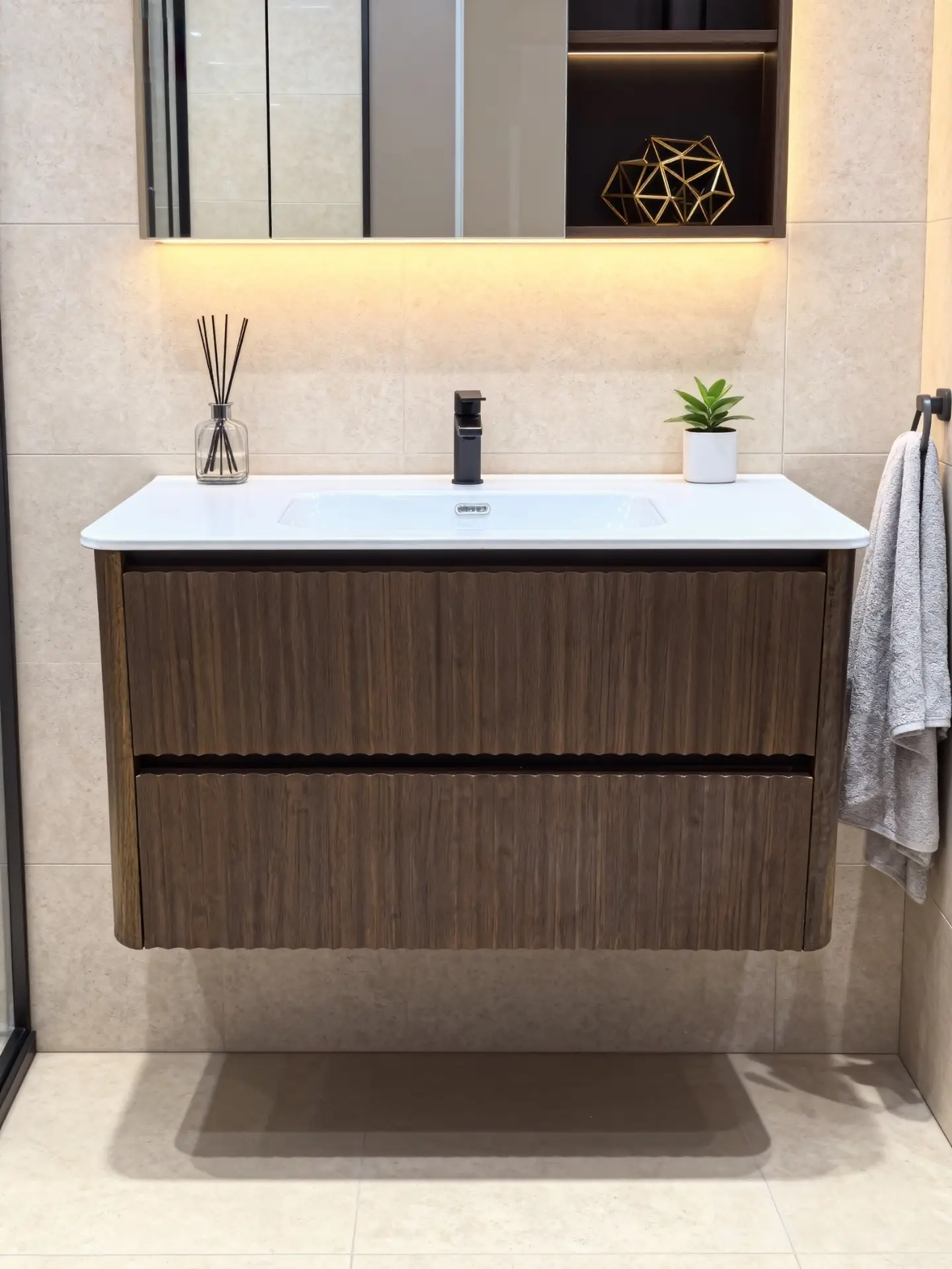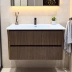 Het ribbelfront van dit meubel geeft een luxe accent dat direct opvalt. De verticale lijnen creëren diepte en verfijning, terwijl het walnootdecor warmte en rust toevoegt aan de badkamer. Dit maakt het meubel geschikt voor uiteenlopende stijlen: van modern en Scandinavisch tot klassiek en boutique-hotel chic.