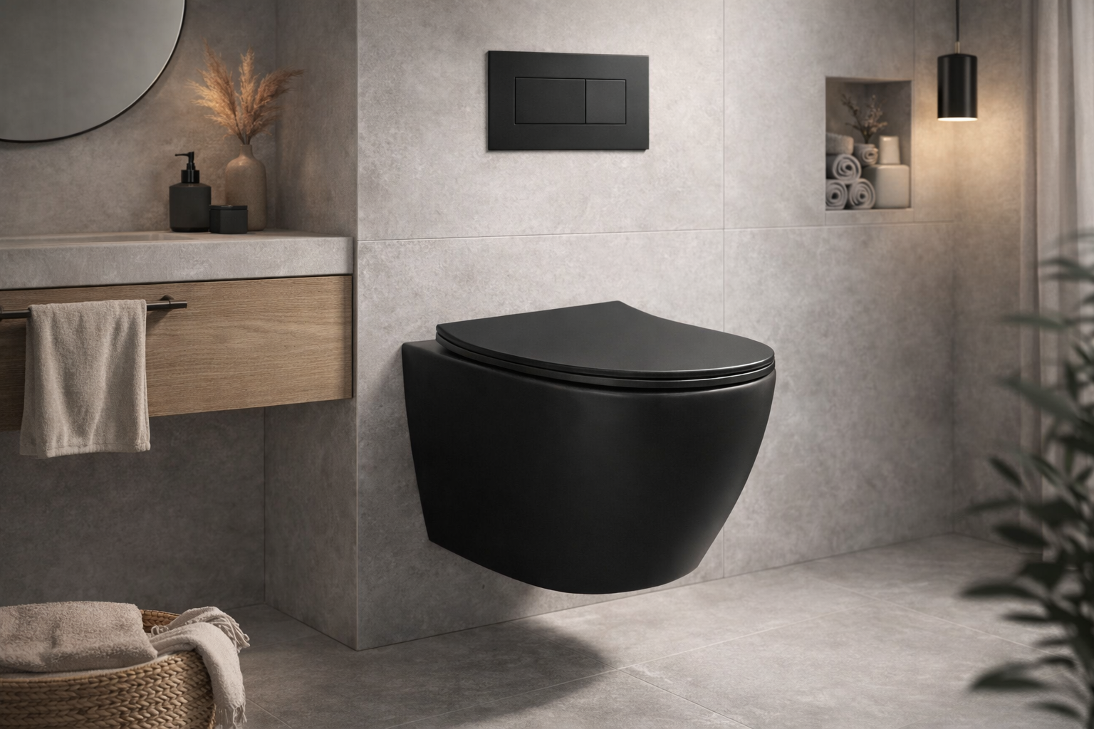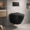 Dit hangende toilet in mat zwart geeft de toiletruimte een krachtige en moderne uitstraling. De wandmontage zorgt voor een strak geheel en maakt het eenvoudig om de vloer rondom het toilet schoon te houden.
