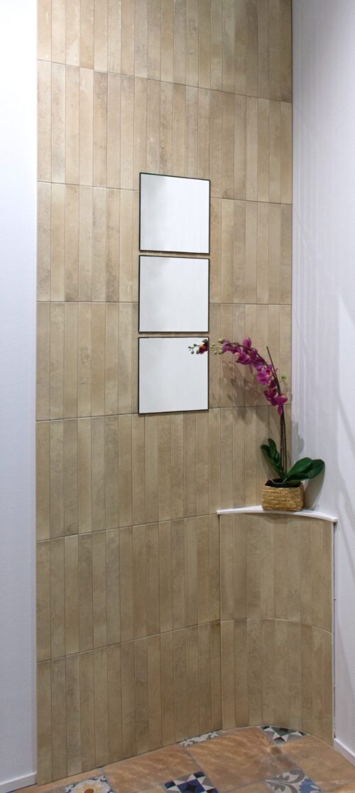 Dankzij het slanke formaat van 5×40 cm krijg je een prachtig lijnenspel op de wand. Leg de tegels horizontaal voor een rustige, brede look, verticaal om de ruimte hoger te laten lijken of kies voor een speels visgraat- of halfsteenspatroon als je net wat meer dynamiek wilt.