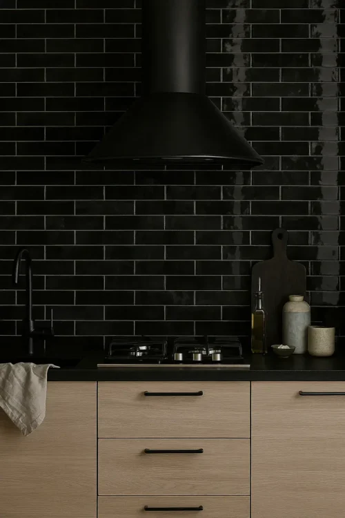 De wandtegel zwart 7,5×30 cm – serie Nissel geeft iedere ruimte een krachtig en tijdloos karakter. De diepe zwarttint zorgt voor een luxe uitstraling, terwijl de glanzende afwerking het licht subtiel weerkaatst en extra diepte aan de wand geeft.