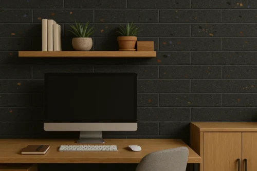 De Wandtegel Terrazzo mat antraciet 7,5×30 cm brengt de herkenbare terrazzo-look naar een moderne, rustige uitvoering. De diepe antracietkleur vormt een strak en tijdloos geheel, terwijl de subtiele terrazzo-spikkels zorgen voor een speels en verfijnd effect op de wand. Deze combinatie maakt de tegel een prachtige keuze voor badkamers, keukens, toiletten of een stijlvolle accentwand.