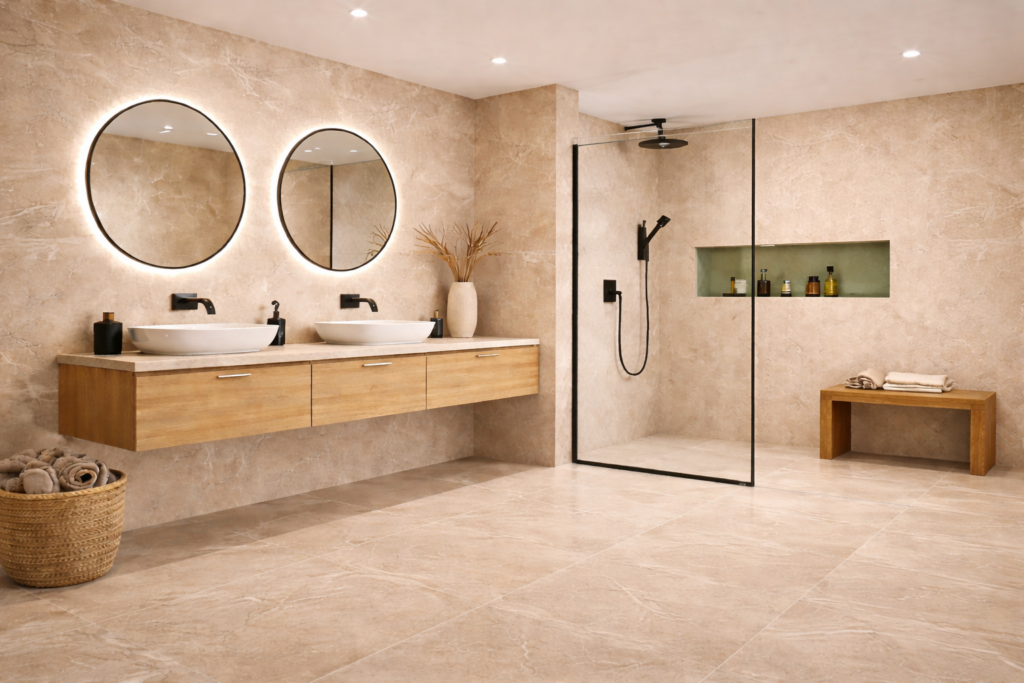 Beige tegels in de badkamer zorgen voor een rustige en ontspannen sfeer. De zachte tint maakt een ruimte licht en ruim. Daardoor ontstaat een comfortabele, spa-achtige uitstraling.