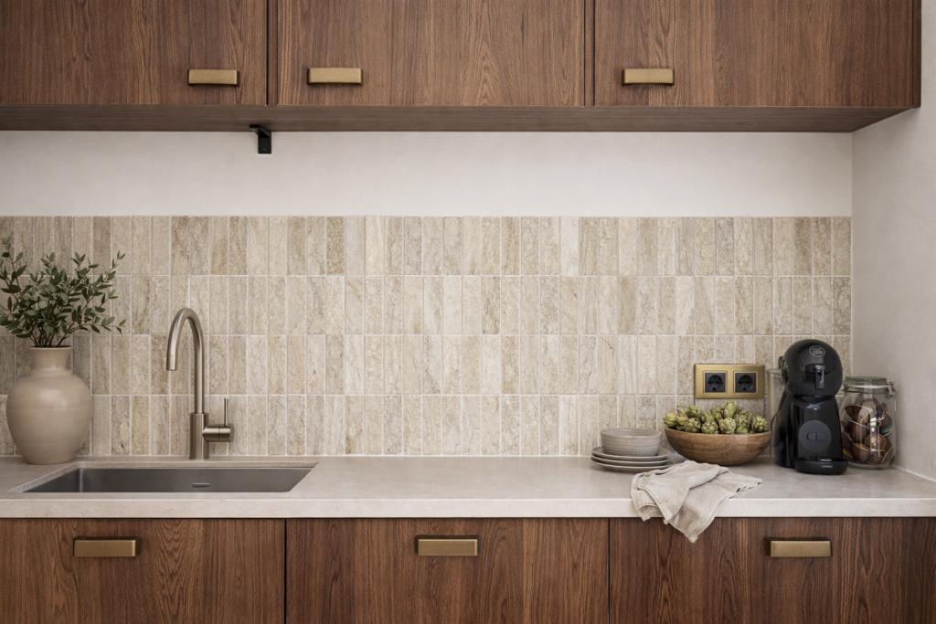 Binnen wandtegels kun je veel variëren in formaat en patroon. Zo geven langwerpige tegels zoals 7,5×30 of 6,5×25 direct meer richting aan de ruimte, bijvoorbeeld in visgraat of halfsteens verband. Dit zorgt voor een speels lijnenspel zonder dat het druk wordt.